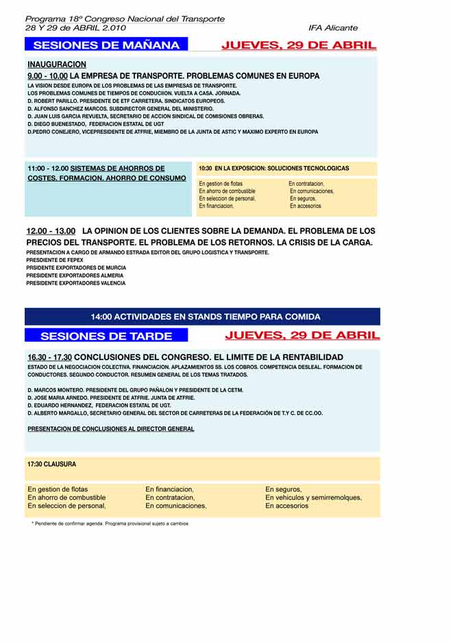 Temas cruciales formarán parte del Programa de Mesas de Trabajo del 18º Congreso, como el Análisis de la nueva Ley de Contrato de Transporte Terrestre, los Cambios en las Cooperativas y el futuro de los Autónomos, Tiempos de conducción y descanso, II Acuerdo General de Transporte, Modelo de gestión de Empresas: flotas propias Vs. externalización progresiva, Directiva de Tiempos de Trabajo, Céntimo Sanitario, Formación en el Sector, entre otros temas.