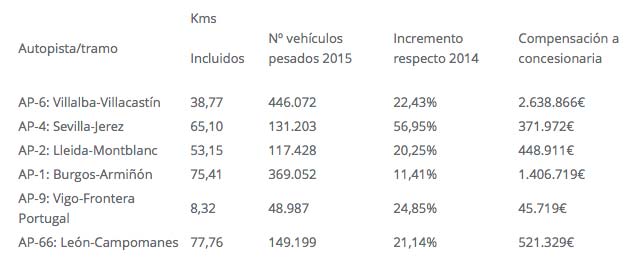 El Plan de Fomento ha tenido como resultado el desvío adicional de 222.703 camiones a las 6 autopistas incluidas, al acumular un tráfico total de camiones pesado de 1.261.941 vehículos en el periodo de aplicación del Plan, esto es, desde el 7 de Julio al 30 de Noviembre de 2015, frente a 1.039.238 vehículos pesados que circularon por dichas autopistas en idéntico periodo en el año 2014.