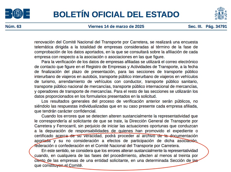 Según los datos que se publican en la Resolución que recurrimos 2.489 empresas confirmaron la representación por Plataforma y, en cambio, a esta Asociación se le aparta directamente de cualquier posibilidad de nombrar representantes ante el CNTC sin mayor explicación que la invocación del apartado Noveno de la Resolución de 10 de marzo de 2025, que, efectivamente, contempla esa posibilidad cuando existan errores que alteren sustancialmente la representatividad y se entiende que se alteran cuando afecten al menos al treinta por ciento de las empresas de una entidad solicitante, pero se establece como una facultad, de ahí el empleo del término “podrá”.