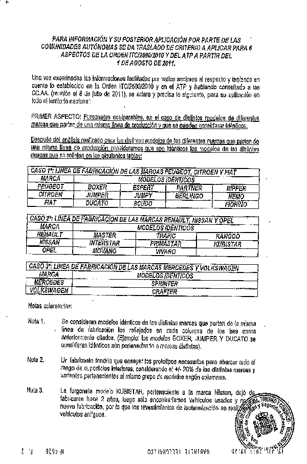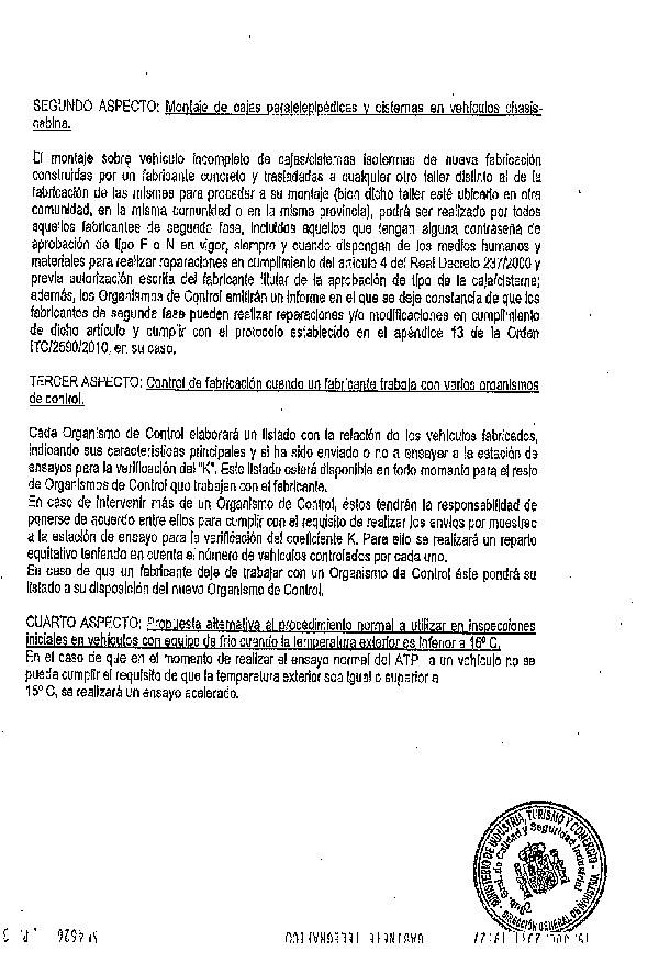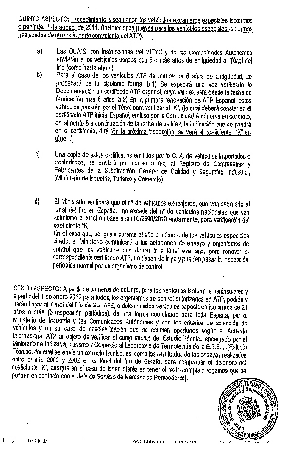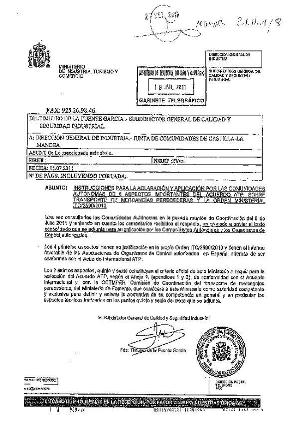 El pasado 15 de julio de 2011, el Ministerio de Industria enviaba, a través de la Subdirección General de Calidad y Seguridad Industrial, y su Subdirector en persona Timoteo de la Fuente García, una comunicación con "Instrucciones para la la aclaración y aplicación por las CC.AA. de 6 aspectos importantes del Acuerdo ATP, sobre tranporte de mercancías perecederas y la Orden Ministerial ITC/2590/2010".