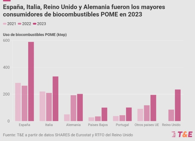 España, Italia, Reino Unido y Alemania fueron los mayores consumidores europeos de POME en 2023. Un tercio de los biocombustibles españoles procedían de POME, mientras que Italia dependía de él en casi un 20%. El consumo de POME en Alemania se cuadruplicó entre 2021 y 2022, pero se mantuvo estable en 2023, a pesar del aumento de las importaciones y la caída de los precios de los biocombustibles.